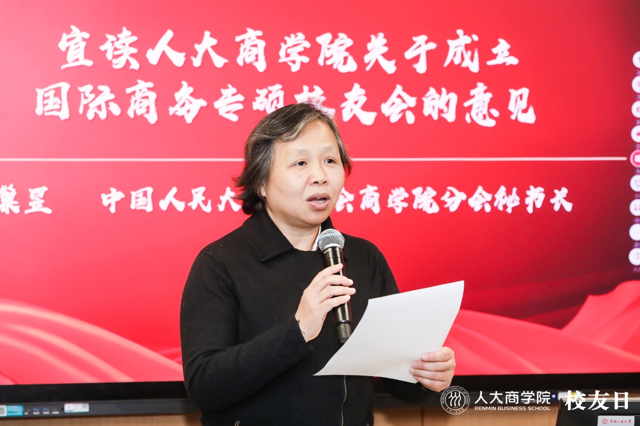 巢昱宣读《关于中国人民大学校友会网上博彩网站大全 分会MIB项目委员会成立的批复意见》及校友会骨干成员名单。
