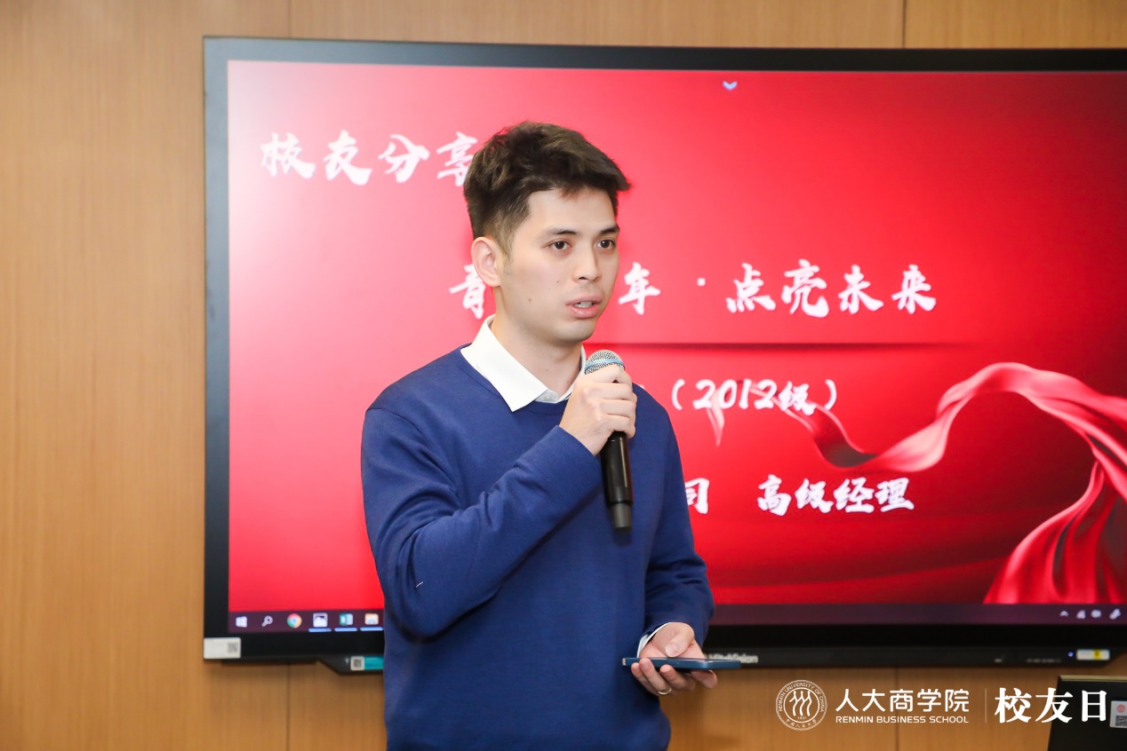 MIB 优秀校友、中央结算公司高级经理杨健邦带来“青春十年·点亮未来”的主题分享。他带领大家回望过去,同时感谢人大网上博彩网站大全 的培养。杨健邦嘱咐大家要有耐心应对工作生活的“无常”,要保持身体健康,要珍惜校友缘分。他感谢网上博彩网站大全 成立MIB校友会,为校友之间搭建了一个交流沟通的桥梁,使大家不仅能拓展有效的社交圈,也能不断地提升MIB项目的市场影响力和吸引力,形成项目和校友的可持续发展。