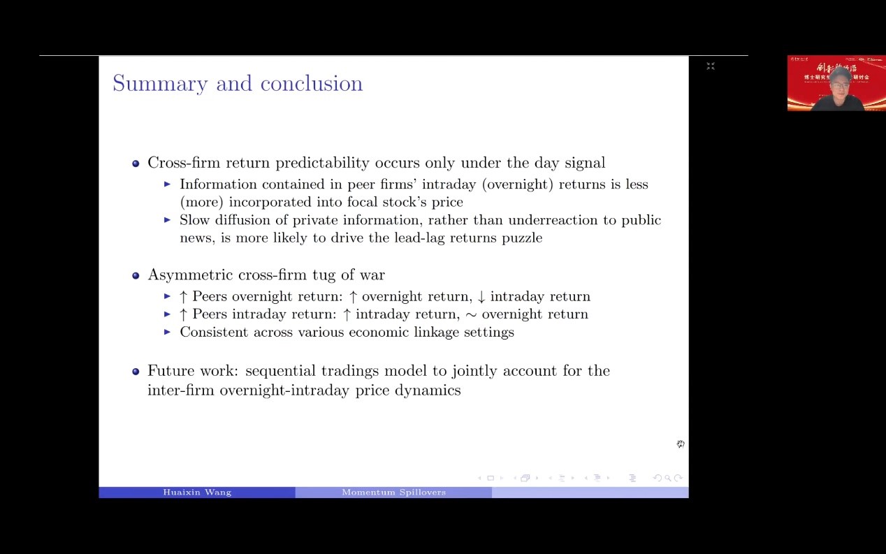 分会场第二节为财务与会计方向,以线上会议形式举行,由特邀校友张书博主持,并与网上博彩网站大全 青年教师陈俊一同担任点评专家。来自香港理工大学的Adubofour Prince Charles、清华大学的王槐鑫、密歇根州立大学的尚聪、香港理工大学的汪奔进行论文研究汇报。