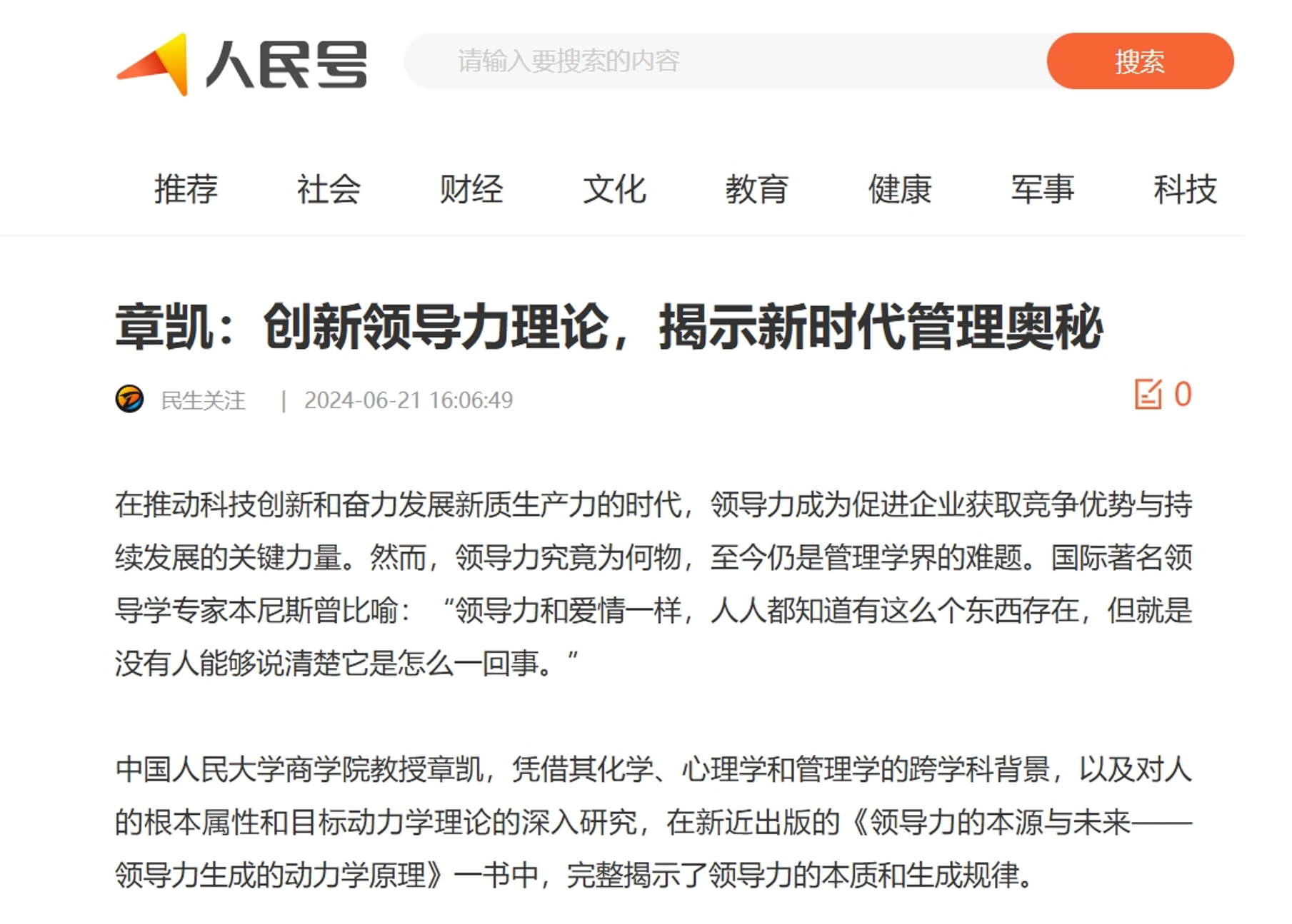 章凯教授的研究专长有:组织行为学、领导力、组织文化、动机与人格、教育心理学等。曾主持国家级重点科研项目并获得结项“优秀”鉴定,创立了动机与人格的自组织目标系统理论(目标动力学)和领导协同论两大理论体系,对兴趣、情绪、动机、人格、领导力、组织文化、管理哲学等问题有着深入与独到的研究。论著曾荣获中国高等学校科学研究优秀成果奖二等奖(2020)、北京市哲学社会科学优秀成果奖二等奖(2017)、中国软科学奖管理学奖(2017)、加拿大管理学会年会最佳论文奖(2009)、中国人民大学优秀著作奖(2006)等。