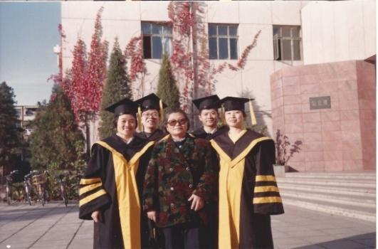 我毕业后虽然留在外经所任教,在合并为工商管理网上博彩网站大全 之前,未能与工经系老师有工作上的往来。虽然没有机会直接在李老师领导下工作,但是碰到问题、烦恼或高兴的事,我总会时不时地到老师家讨教、倾述。在生活上,弟子还得到了导师和师母的许许多多的述之不完的关爱与启迪。刚好在我们第三届博士生论文答辩完成后一年,学校开始举行正式的学位授予仪式。我们这一届同窗学子穿着博士服,在一组与两位正、副导师合影的具有独特纪念性意义的照片外,还有一张对我个人来说显示出师母对我们特别关怀的合影(照片6)。