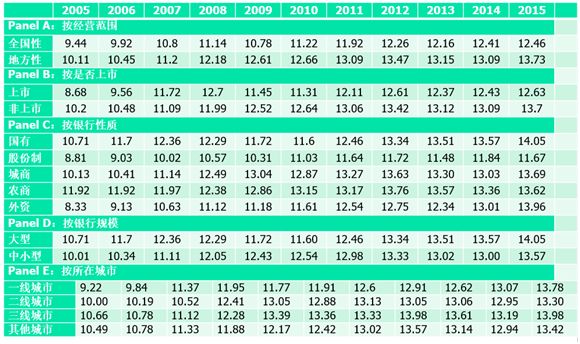 根据2005年-2015年商业银行的资本充足率数据,全国性大银行比地方金融要低,上市银行比非上市的要低,但国有银行比非国有银行的资本充足率要高,一线城市资本充足率比二线和其他线相比要高一些,平均在13%-14%。而不良贷款率在总体上看,不良贷款率国有银行要比非国有银行高,非上市的要比上市的高一些,地方性银行要比全国性的商业银行高一些。