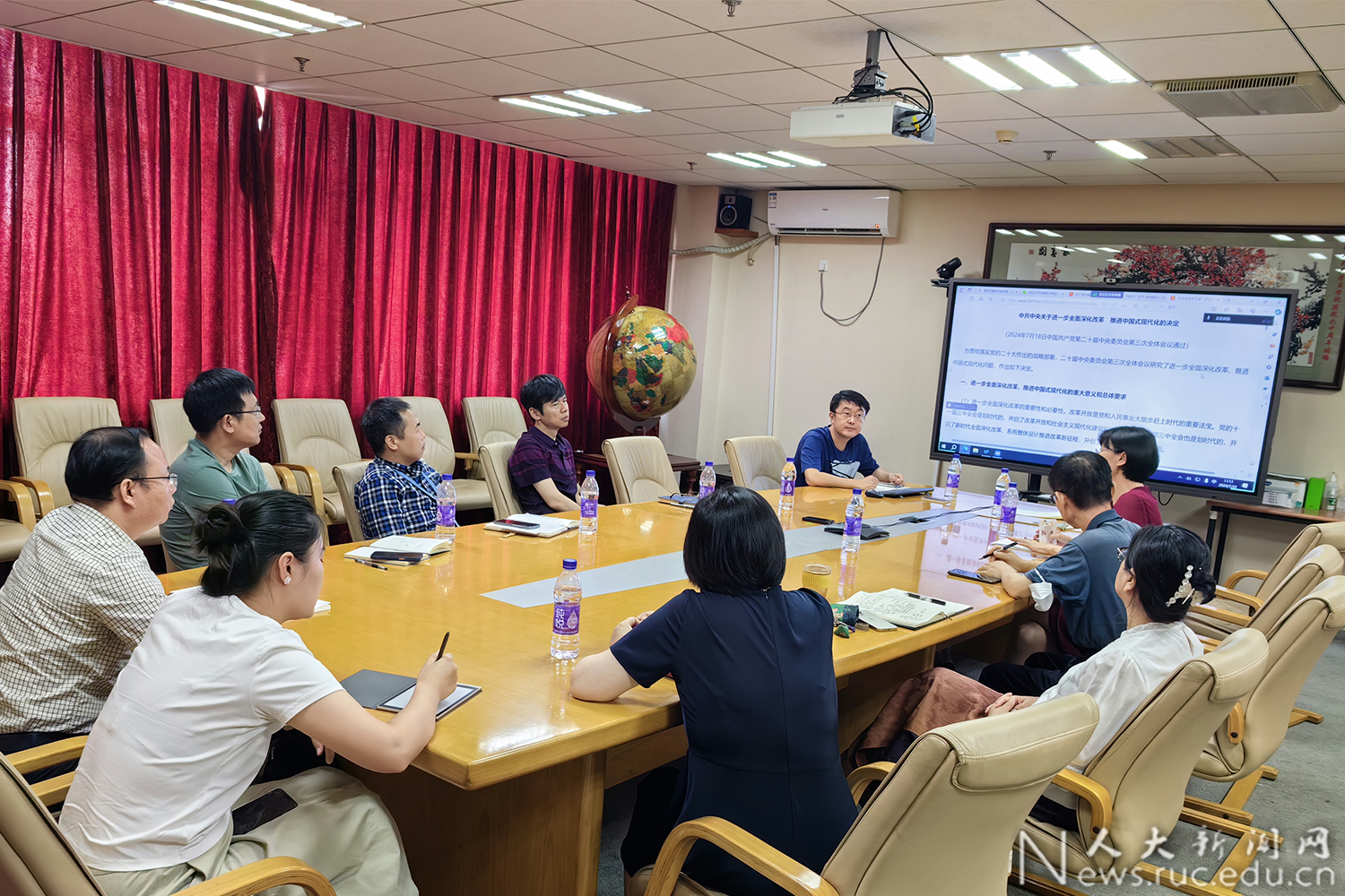 会前,与会成员认真学习了《中国共产党第二十届中央委员会第三次全体会议公报》《中共中央关于进一步全面深化改革、推进中国式现代化的决定》、7月19日中国人民大学党委理论学习中心组(扩大)专题学习会精神。会上,旋天颖书记领学“习近平总书记关于《中共中央关于进一步全面深化改革、推进中国式现代化的决定》的说明”,带领与会人员进一步深入了解党的二十届三中全会召开的重要历史意义、作出的重大战略部署等。与会人员聚焦网上博彩网站大全 中心工作,结合学科专业领域和本职工作分享学习体会,展开深入研讨。