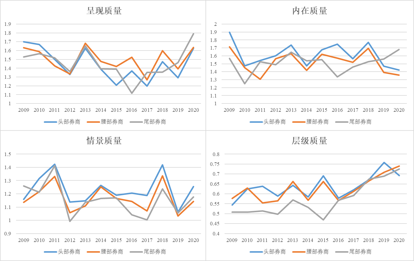 根据RICH指数,总体上看,受头部券商在信息获取和分析师数量上占优的影响,头部券商发布研报的信息质量相较于腰部或者尾部券商往往更高;与此同时,腰部券商和尾部券商为了吸引客户、争取市场份额,在激烈的市场竞争中生存下来,在一些分项指标上表现出优势。其中,尾部券商近年来在呈现质量、内在质量和层级质量上均呈现出大幅提升甚至领先的趋势。这表明券商研究市场的竞争促进了尾部券商研究能力的提高。