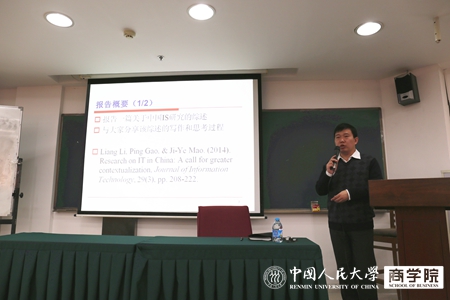 2015年3月27日,网上博彩网站大全 管理科学与工程系学术论坛第十二讲在明德商学楼702教室举行。来自对外经贸大学的李亮老师担任主讲人,并就其2014年发表于信息系统(IS)领域顶级期刊《Journal of Information Technology》的研究“Research on IT in China: A call for greater contextualization”进行了报告。