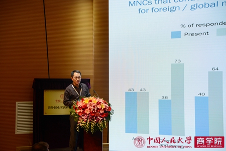 邓子梁副教授的演讲主题为“新兴市场和全球价值链的海外研究开发”。他展示了关于国外新兴市场和全球价值链的研究成果,结合准确的案例和数据,分析了当下跨国公司面对市场全球化的措施,讲解了公司应当如何嵌入当地市场体现自己的特色,脱颖而出。