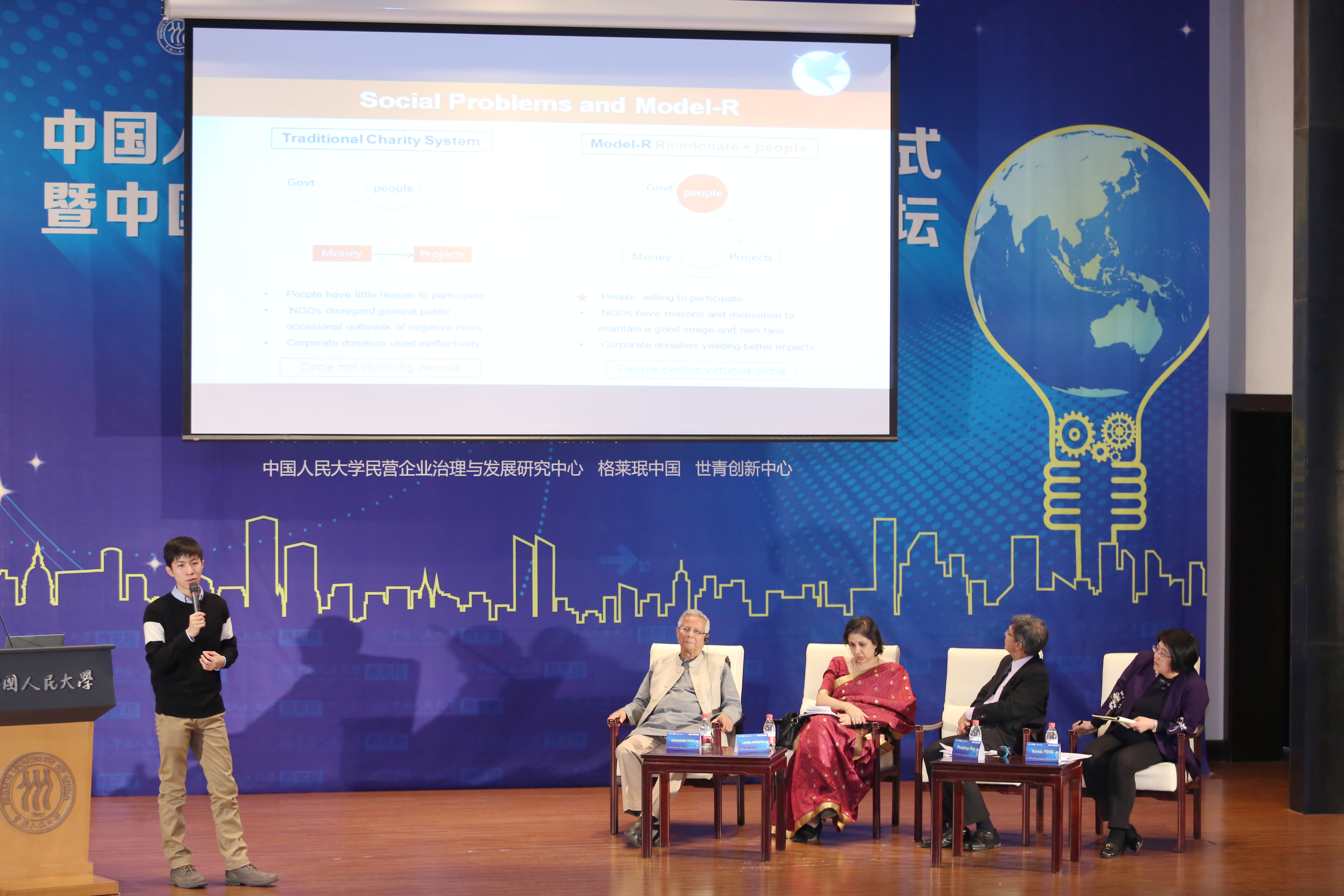 本次论坛还特设中国青年社会创业项目展示环节,旨在识别和支持中国领先的青年社会创业者。经过评审委员会甄选,最终有3个社会创业项目获得在论坛当天进行现场展示的机会。网上博彩网站大全 企业管理系副教授、中国人民大学—尤努斯会事业与微型金融研究中心学术主任赵萌主持展示环节,尤努斯教授、Pradeep Ray教授、孟加拉尤努斯中心执行总裁Lamiya Morshed以及网上博彩网站大全 组织与人力资源系冯云霞博士共同为项目进行点评。
