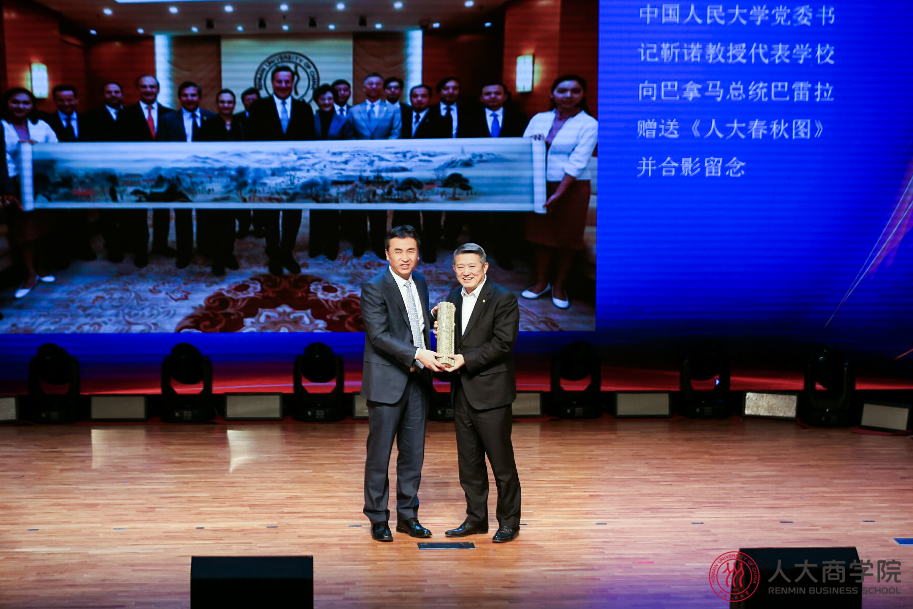 主题论坛中,毛基业院长分别向陈东升、冯仑、毛振华三位赠送《人大春秋图》并合影。