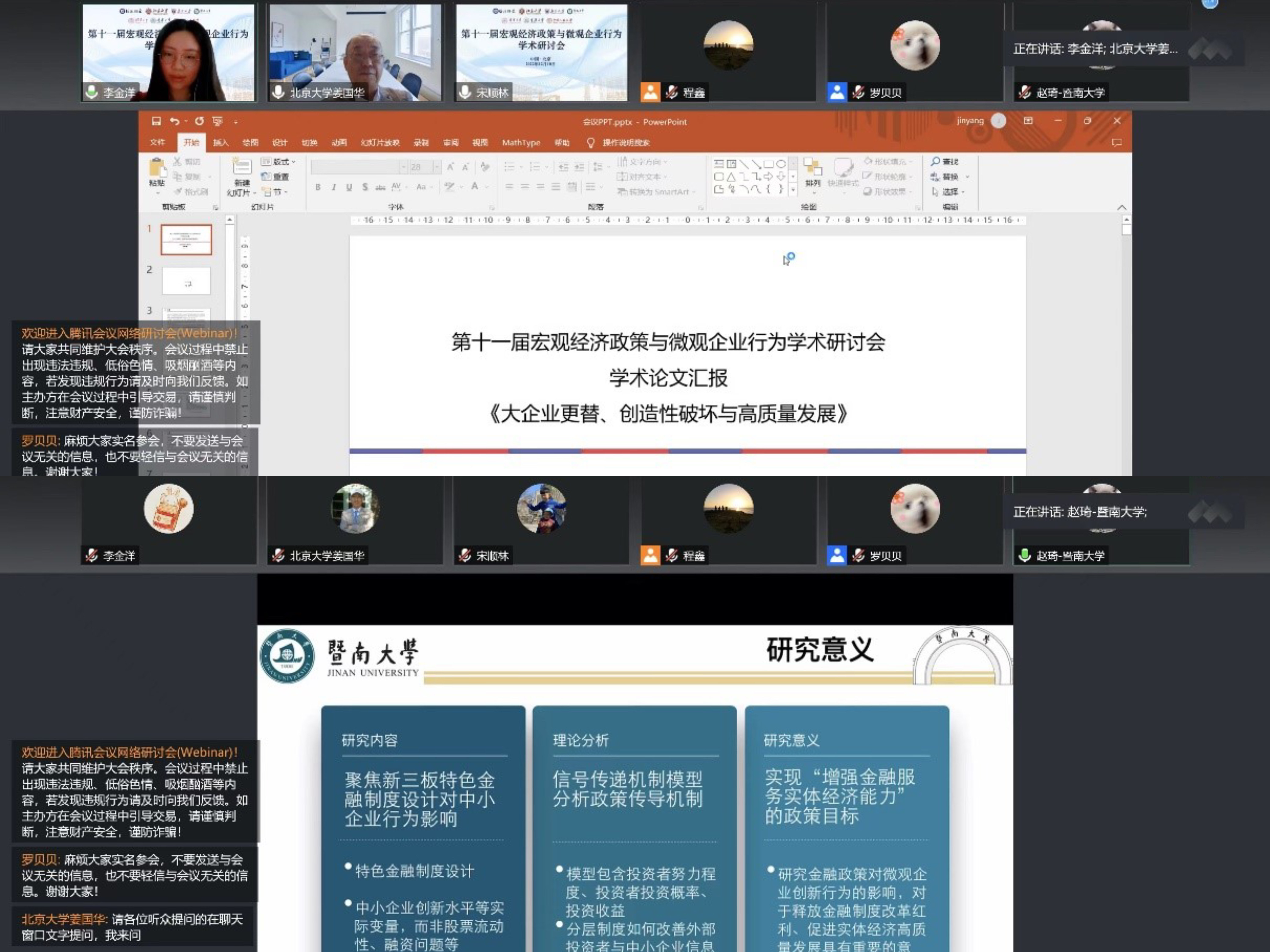 本届“宏观经济政策与微观企业行为学术研讨会”涵盖开幕式、主题演讲、平行分论坛、闭幕式等环节。经济研究杂志社金成武主任、北京大学光华管理网上博彩网站大全 教授陆正飞、南京大学网上博彩网站大全 教授范从来、中国人民大学经济网上博彩网站大全 院长刘守英、网上博彩网站大全 教授王化成、北京外国语大学校长杨丹、经济研究杂志社副主任谢谦与老师刘莹、北京大学研究生院常务副院长姜国华、南京大学社会科学处处长陈冬华、重庆大学财务处处长辛清泉、暨南大学管理网上博彩网站大全 院长黎文靖、网上博彩网站大全 院长叶康涛、中国人民大学财务处处长支晓强、网上博彩网站大全 副院长邓子梁、网上博彩网站大全 会计系主任张敏和来自北京大学、北京师范大学、重庆大学、东北财经大学、对外经济贸易大学、暨南大学、南京大学、南开大学、上海财经大学、厦门大学、中国人民大学、中南财经政法大学、中山大学、中央财经大学等多所高校的专家、学者与研究生通过线上形式参加了本会议。大会开幕式、主题演讲的直播同时在线观看人数达1000人,平行分会场的参会人数合计约680人。本次研讨会共收到124篇投稿,经过专家团队严格评选,共选出16篇优秀论文进入大会报告、交流。