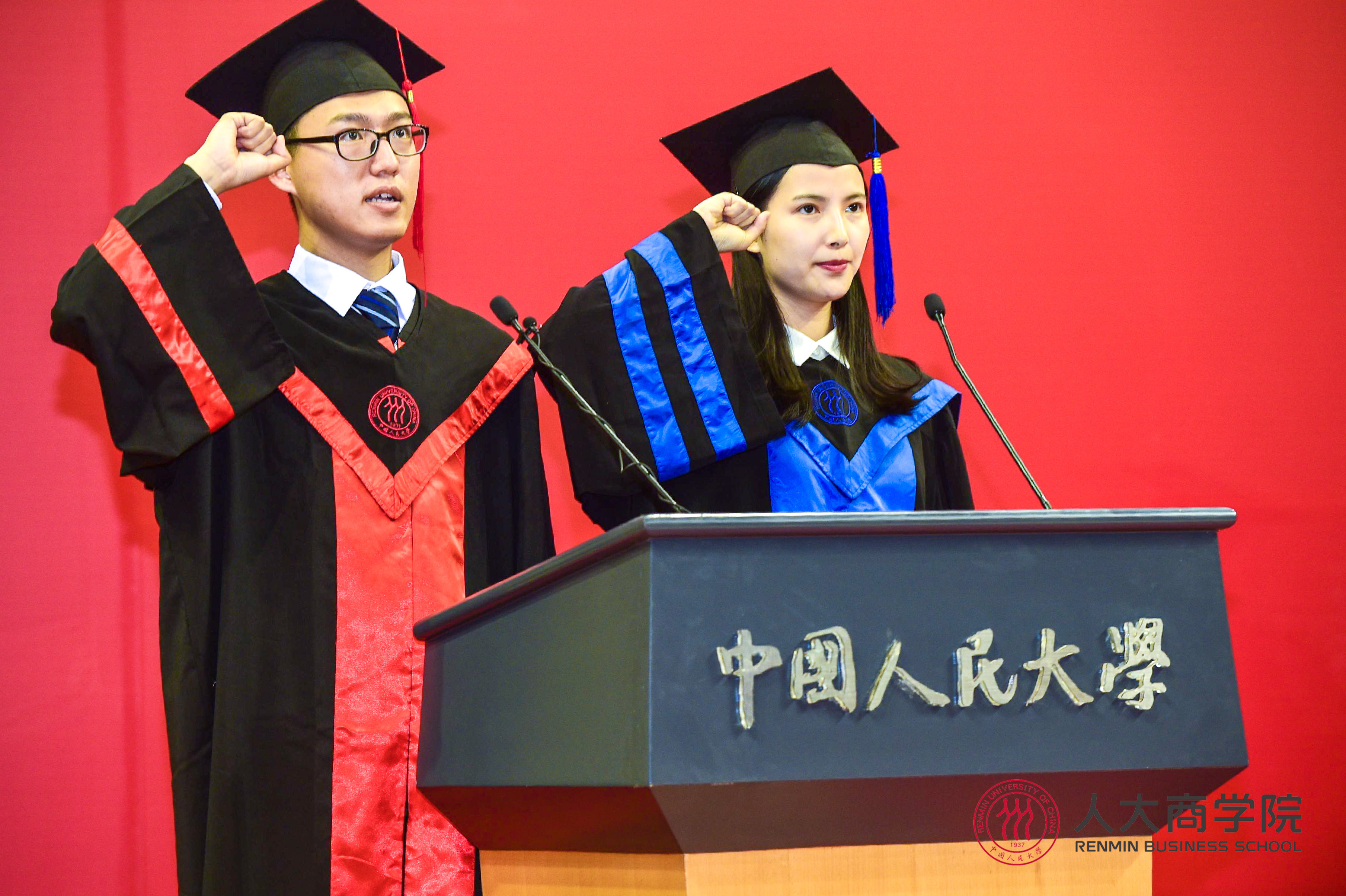 在毕业宣誓环节中,2016级会计专业硕士研究生王淑婷、2014级会计学专业本科生卫立国带领全体毕业生庄严宣誓。