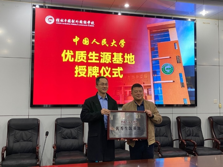 在桂林市国龙外国语学校,招生组向校长颁授“中国人民大学优秀生源基地”牌匾,感谢该校多年持续向我校输送大量优秀高中毕业生,并祝愿该校学生在2023年高考中再创辉煌。