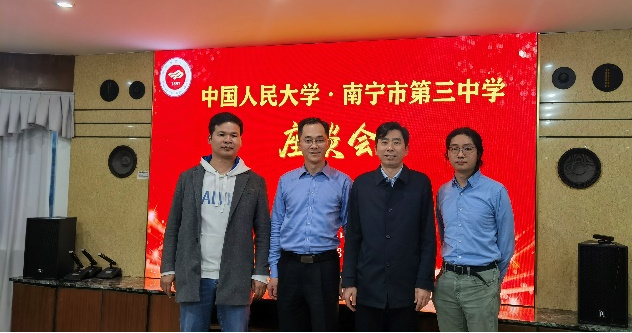 2023年3月29日至4月1日,中国人民大学广西招生组组长、网上博彩网站大全 副院长邓子梁教授率队赴广西南宁、柳州、桂林三地,参加了由广西招生考试院组织的高校招生座谈会,并深入广西知名高中——桂林国龙、柳州高中、柳铁一中、南宁三中、南宁二中教学一线,进行了宣讲、调研等活动。中国人民大学本科生招生办公室副主任孟凡超,广西招生组副组长、网上博彩网站大全 副教授吴武清,高瓴人工智能网上博彩网站大全 助理教授毛佳昕共同参加活动。