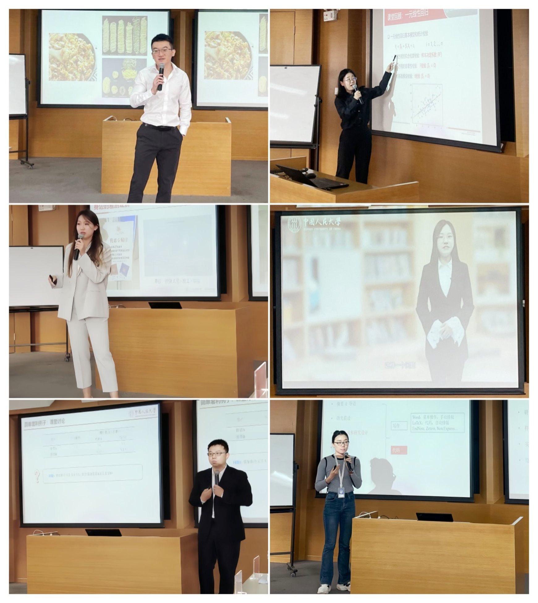 殷佳敏以“多元线性回归”为题进行展示。教学内容包括多元线性回归的基本思想和模型概况、模型假设、模型进阶以及SPSS应用实例和STATA应用实例。她秉持化繁为简、实事求是、培养批判性思维能力和扎根中国实践的教学思想,结合数据案例讨论与互动式教学方法,帮助学生提升数据分析能力和思维能力。