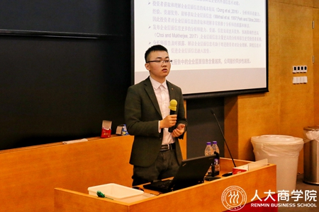 下午第二场由博士研究生李昕宇报告论文《员工持股计划与企业创新》。文章研究了员工的持股计划对于公司创新行为的影响,发现主要针对普通员工的持股计划能够显著促进公司的创新。楼栋教授建议论文在当前的基础,进一步确定持股计划对于员工的激励作用以及员工促进公司创新的机制。