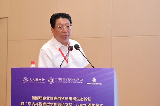 叶康涛对出席本次活动的嘉宾表示欢迎。他提到,企业管理哲学与组织生态研究中心是为了纪念我国著名的企业管理学家李占祥先生于2019年10月成立的,并每年举办论坛。设立李占祥管理哲学奖旨在从哲学高度提炼和探讨中国企业的重大问题,推动企业管理的学科发展和实践应用,努力构建中国特色企业管理理论体系的学术自信。本次论坛以中国式现代化的组织管理智慧为主题,聚焦中国本土企业管理思想与管理理论创新、数字时代企业管理哲学的创新思考与理论发展等重大具有中国特色的时代议题。希望各位参加论坛的学界名师才俊、业界精英翘楚能借此机会进行思想的交流碰撞,发扬理论联系实际的优良作风。