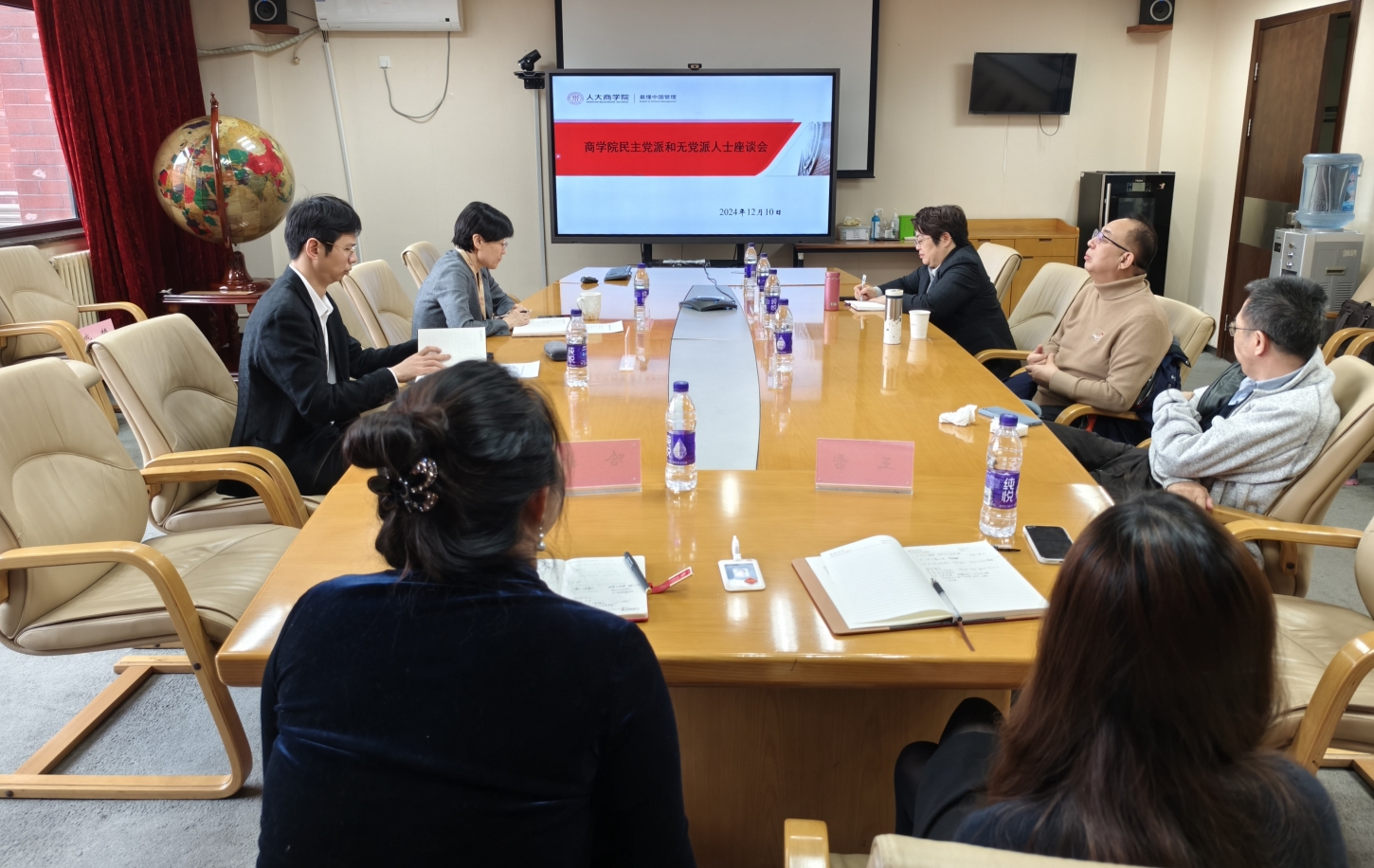 2024年12月10日,网上博彩网站大全 民主党派和无党派人士代表座谈会在明商712会议室召开。网上博彩网站大全 党委书记旋天颖、院长易靖韬以及来自民盟、民建、九三学社和无党派人士代表参加会议。党委书记旋天颖主持会议。
